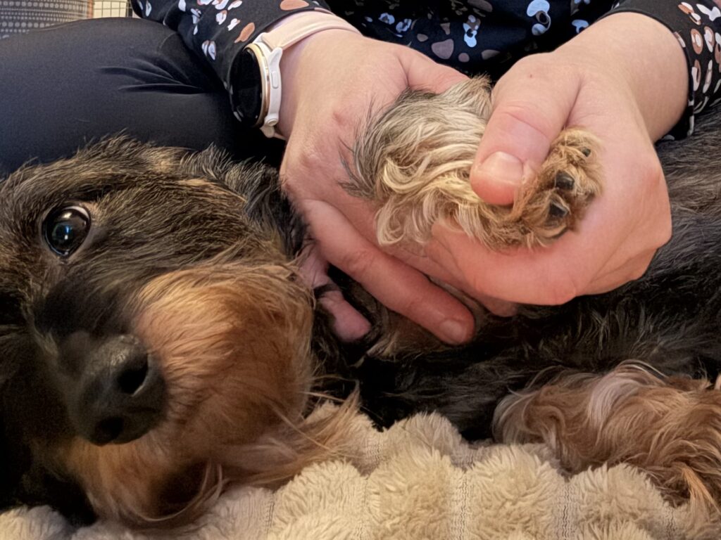 Kk- mäyräkoira KVA-MÄAJ Korpiklaanin SE Pohjan Akka eli Luru reilun vuoden ikäisenä metsästyskauden jälkeen tarvitsi hierontaa. Olisi tarvinnut jo kauden aikana, jotta ei olisi tullut näin pahoja lihasjumeja.